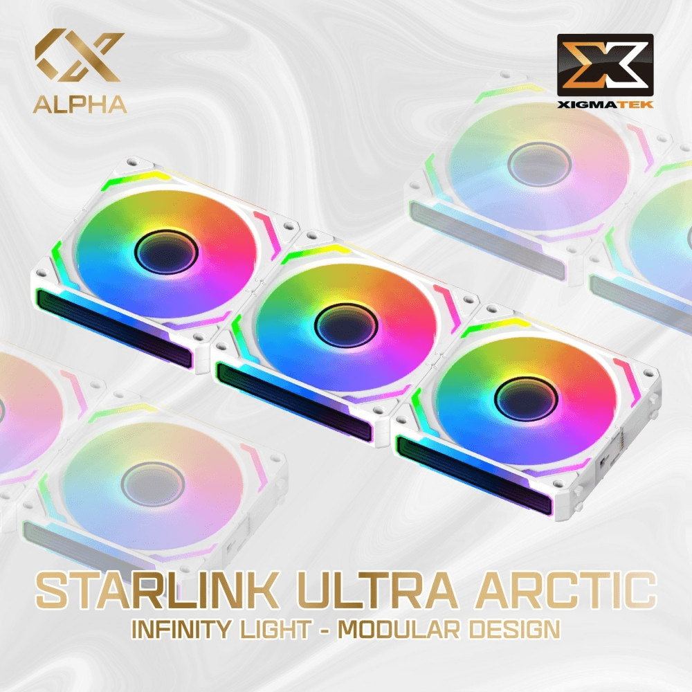 - Bộ 3 quạt Xigmatek STARLINK ULTRA ARGB BLACK: Bộ 3 quạt Xigmatek 120mm trang bị LED ARGB tại HUB, cho hiệu ứng ánh sáng nổi bật và khả năng tùy chỉnh linh hoạt. Quạt vận hành với tốc độ 800–2000 RPM, lưu lượng gió 65.5 CFM, áp lực gió 2.05 mmH2O cùng độ ồn thấp <29.2 dBA, đảm bảo tản nhiệt hiệu quả và êm ái.