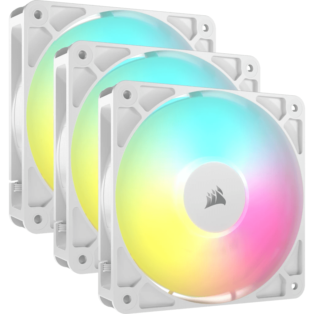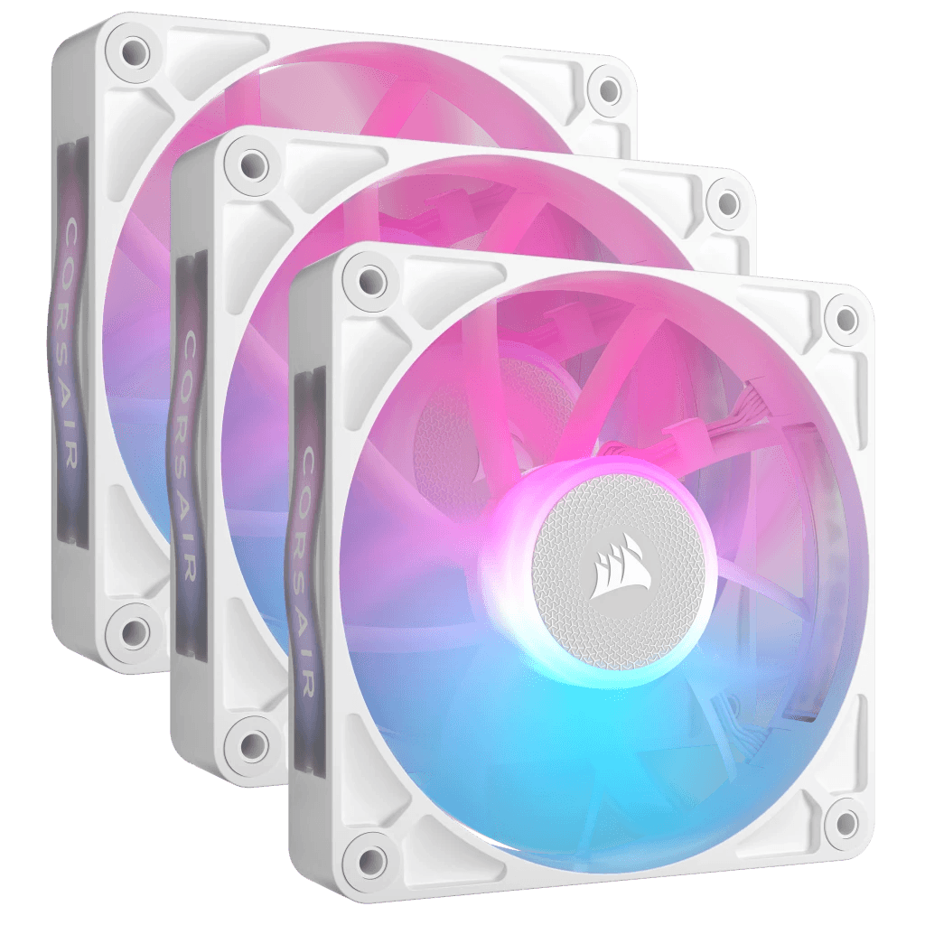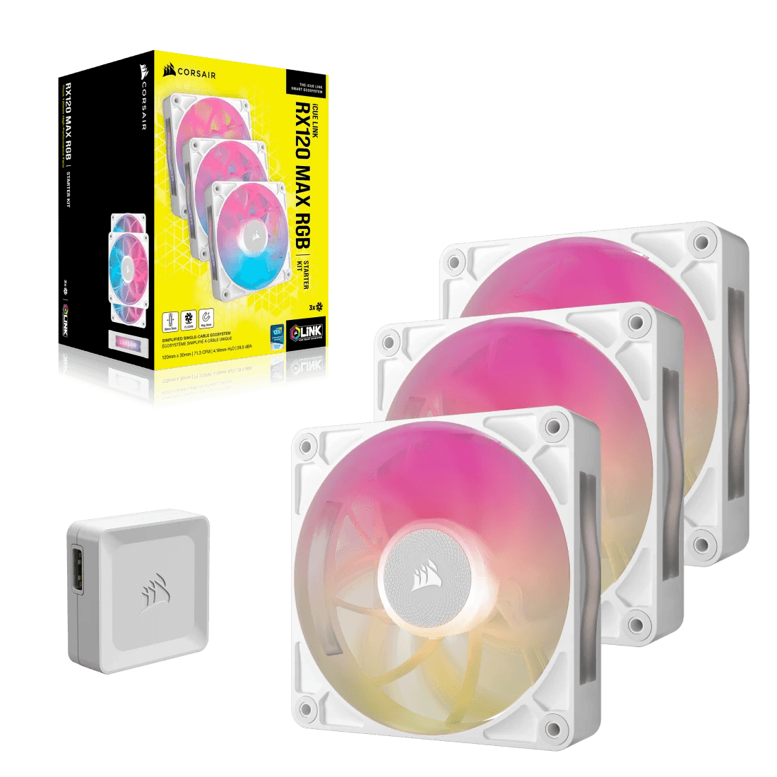 - Bộ 3 quạt Corsair iCUE LINK RX120 MAX RGB White: Corsair iCUE LINK RX120 MAX RGB White nổi bật với thiết kế cánh quạt dày 30mm, cho áp suất tĩnh cao và hiệu suất tản nhiệt vượt trội. Sản phẩm sử dụng vòng bi từ tính bền bỉ, vận hành êm ái và hỗ trợ công nghệ iCUE LINK giúp kết nối gọn gàng, đồng bộ ánh sáng RGB thông minh.