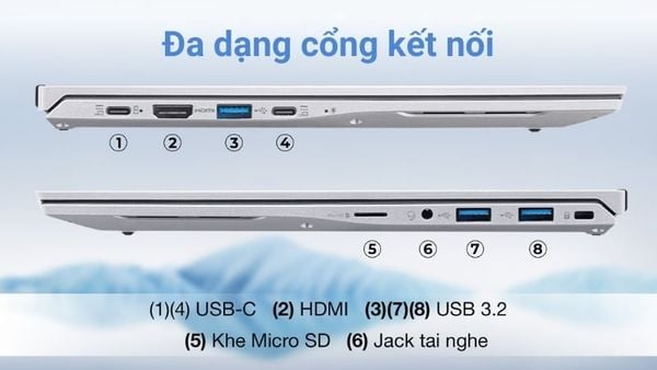 Máy được trang bị cổng USB-C, USB-A, HDMI và khe đọc thẻ, có thể đáp ứng nhu cầu kết nối với nhiều thiết bị ngoại vi như chuột, bàn phím, màn hình rời hay ổ cứng di động. Ngoài ra, kết nối Wi-Fi 6 và Bluetooth còn hỗ trợ truy cập Internet ổn định và kết nối thiết bị không dây nhanh chóng, phù hợp khi bạn làm việc ở các không gian linh hoạt như thư viện hoặc quán cà phê.
